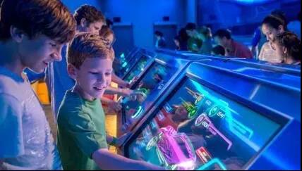Epcot 入 口 標(biāo) 志 性 的 大 球 就 是Spaceship Earth。游客乘坐沿室內(nèi)軌道行進(jìn)的“宇宙飛船”,進(jìn)行一次舒緩的太空旅行,兩側(cè)是逼真的雕塑,展現(xiàn)人類文明的發(fā)展進(jìn)步史。船艙內(nèi)有互動(dòng)顯示屏,會(huì)顯示一些有關(guān)未來生活的簡(jiǎn)單問題,可以根據(jù)自己的喜好進(jìn)行選擇,游戲結(jié)束時(shí)會(huì)自動(dòng)生成一段動(dòng)畫短片,see yourself in the future。