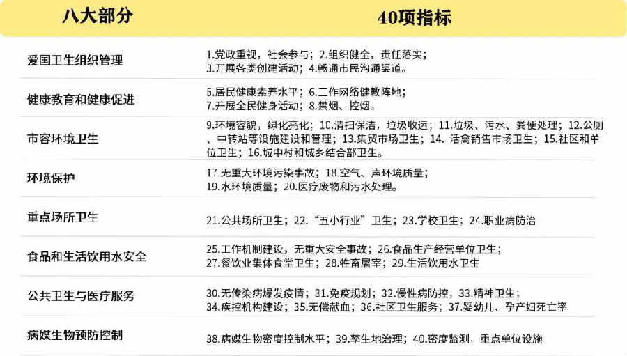 本標(biāo)準(zhǔn)適用于除直轄市以外的設(shè)市城市和直轄市所轄行政區(qū),分八大部分、40項指標(biāo)。