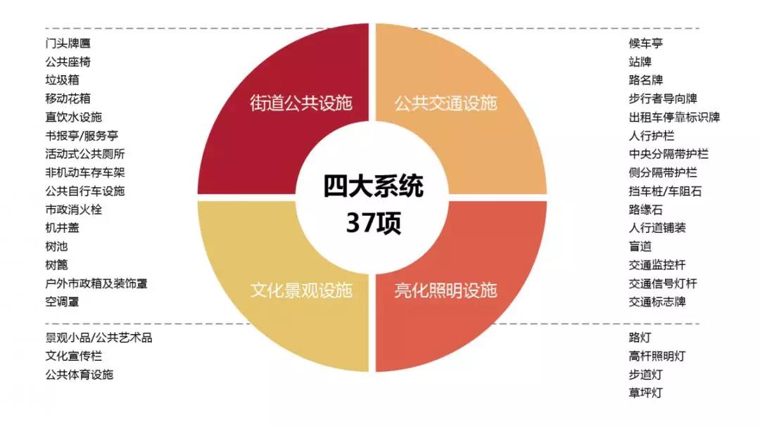 我們根據(jù)城市家具的功能屬性,對(duì)城市家具各類設(shè)施進(jìn)行系統(tǒng)性分類,依據(jù)現(xiàn)狀,可暫分為街道公共設(shè)施、公共交通設(shè)施、文化景觀設(shè)施、亮化照明設(shè)施四大系統(tǒng)三十七項(xiàng)。