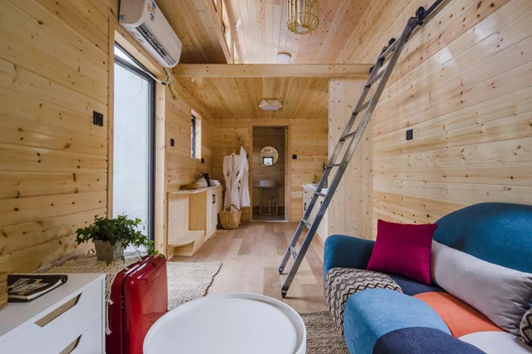 沿著階梯上到一層,一進門就是舒適的雙人床和超大的落地玻璃窗,窗口望出去一片綠意盈盈。室內(nèi)擺放的都是純天然原木家具和手工粗陶餐具,配有地暖、空調(diào)、迷你冰箱、藍牙音箱等設(shè)備,堪稱自然與現(xiàn)代相結(jié)合的典范。