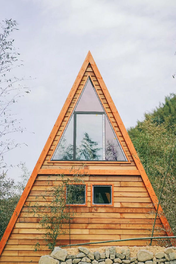 建筑的弧頂形態(tài)流暢,大老遠就很引人注目??拷毧?,每一塊木頭的形狀都是獨一無二的。同時設(shè)計師根據(jù)人的動線和視線,開啟了多個視覺窗戶,使得在鳥巢loft中站、坐、臥、仰,可以欣賞到周遭的不同風光。