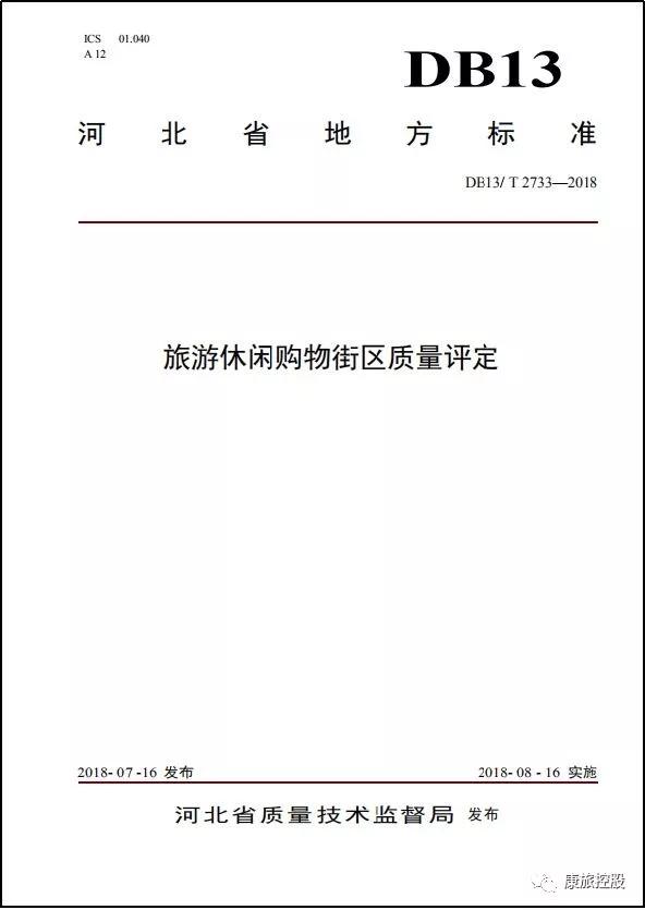 為促進全省旅游購物標準化、規(guī)范化、品牌化發(fā)展,由河北省文化和旅游廳、康旅控股集團文旅工程建設版塊智力資源中心共同制定的河北省地方標準《旅游休閑購物街區(qū)質量評定》(DB13/ T 2733—2018),于2018年8月16日正式實施。
