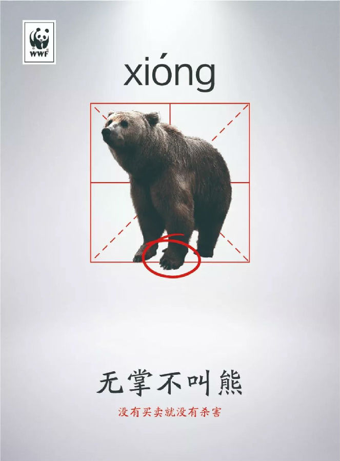 隨著經濟的快速發(fā)展,一部分人對美麗的追求變得越來越狂熱,甚至變得很殘忍。這種殘忍的交易遍布全球涉及到生活的方方面面,比如:鯊魚鰭、熊掌、象牙等。三幅畫面中的動物都圈住了了最為珍惜的部位,米字格和拼音是作為識字認字的最規(guī)范的方式,也是表達最直接的方式,圈住珍貴部位的動物被放在米字格中間,還被強行的叫做它原來的名字,看似還存在的東西,被無知愚昧的人們拿來做殘忍的事情,通過三幅系列畫面來表達出一部分人自認為美麗的背后卻隱藏著殘忍的秘密,實際突出“沒有買賣就沒有殺害”主旨 。