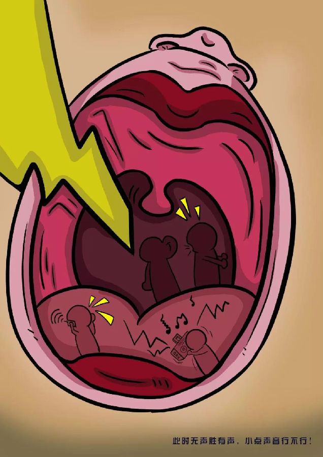 禁止大聲喧嘩:一個巨大的嘴巴里發(fā)出刺耳的噪聲,嘴巴里面的人有的也在大聲說話,有的在大聲打電話,而有一個還在外放音樂跳舞。他們同樣也在制造噪聲。此時無聲勝有聲,小點聲音行不行!