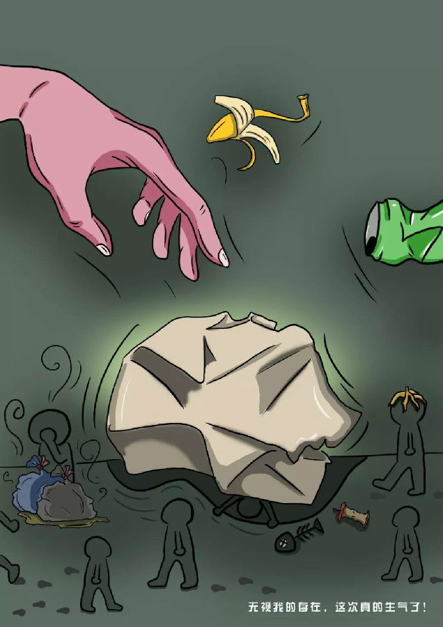 禁止亂扔垃圾:一只手無視下方的人,扔下一個紙團,紙團下面有一個被砸到的人。有的人頭上掛上了香蕉皮,有的人被垃圾堵住了去路。地上滿是垃圾,污穢不堪。人們都很生氣,無視我的存在,這次我真的生氣了!