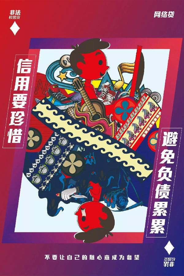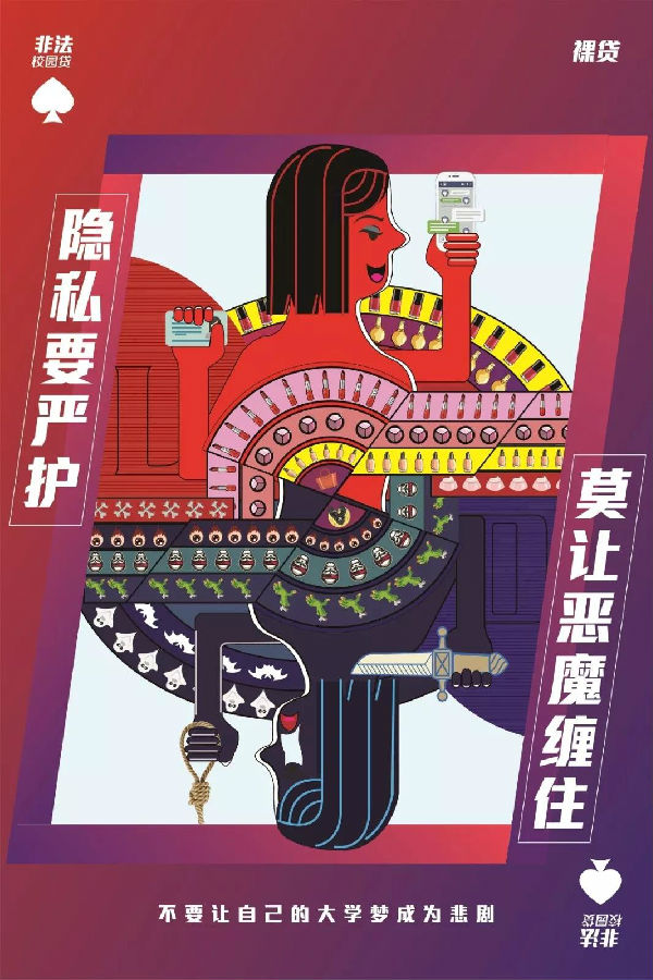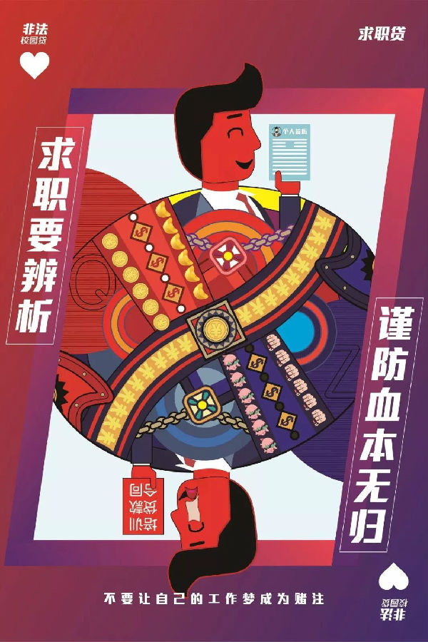 非法校園貸分三部分,列舉典型的裸貸、求職貸、網絡貸,運用撲克的形式,來表現(xiàn)非法校園貸的兩面性,認清風險,遠離不良貸。
