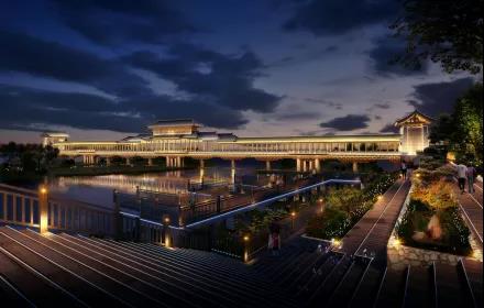 位于漢碼頭的槐河廊橋由康旅集團(tuán)設(shè)計(jì)建設(shè),位于槐河高鐵線東側(cè),緊鄰漢碼頭廣場(chǎng),全長(zhǎng)約260米,通行寬度3米,兩側(cè)設(shè)有景觀眺臺(tái)?;焙永葮蛲瑯邮窃蠞h文化集成的代表,風(fēng)格以“新漢風(fēng)”為主。橋身中央為重檐風(fēng)雨長(zhǎng)廊,也是槐河景觀的最佳觀賞點(diǎn)。橋頭的漢代牌樓簡(jiǎn)潔大方,槐河廊橋夜晚的整體亮化同樣成為槐河景觀帶標(biāo)志性閃光點(diǎn)之一。