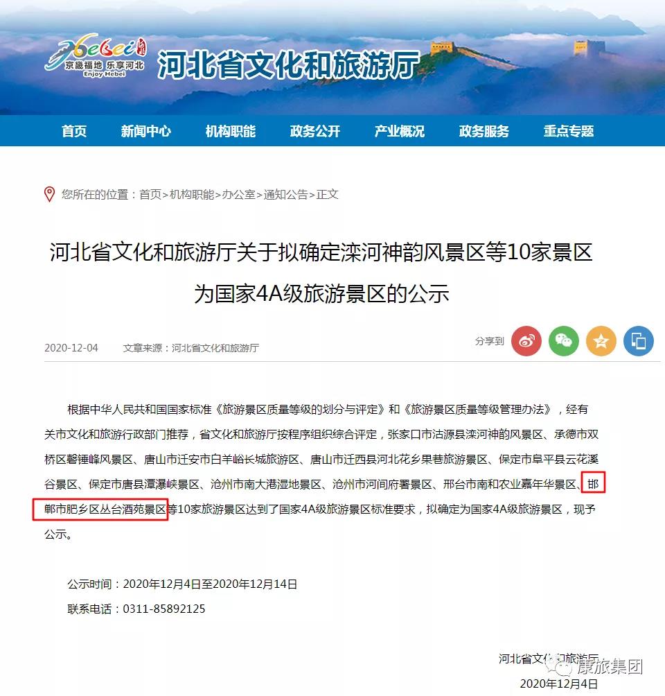 據(jù)河北省文化和旅游廳發(fā)布公示,邯鄲市肥鄉(xiāng)區(qū)叢臺酒苑景區(qū)在內(nèi)的10家旅游景區(qū)擬確定為國家4A級旅游景區(qū)。熱烈祝賀!