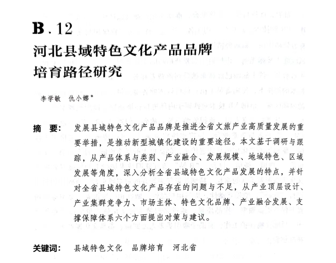 其中,我院所發(fā)表的《河北縣域特色文化產(chǎn)品品牌培育路徑研究》文章全面介紹了發(fā)展縣域特色文化產(chǎn)品品牌在推進(jìn)全省文旅產(chǎn)業(yè)高質(zhì)量發(fā)展的重要舉措,分別從總體情況、存在不足、發(fā)展策略等角度進(jìn)行探究,對新形勢下河北省縣域特色文化產(chǎn)品品牌的培育路徑具有較深的推廣借鑒意義。
