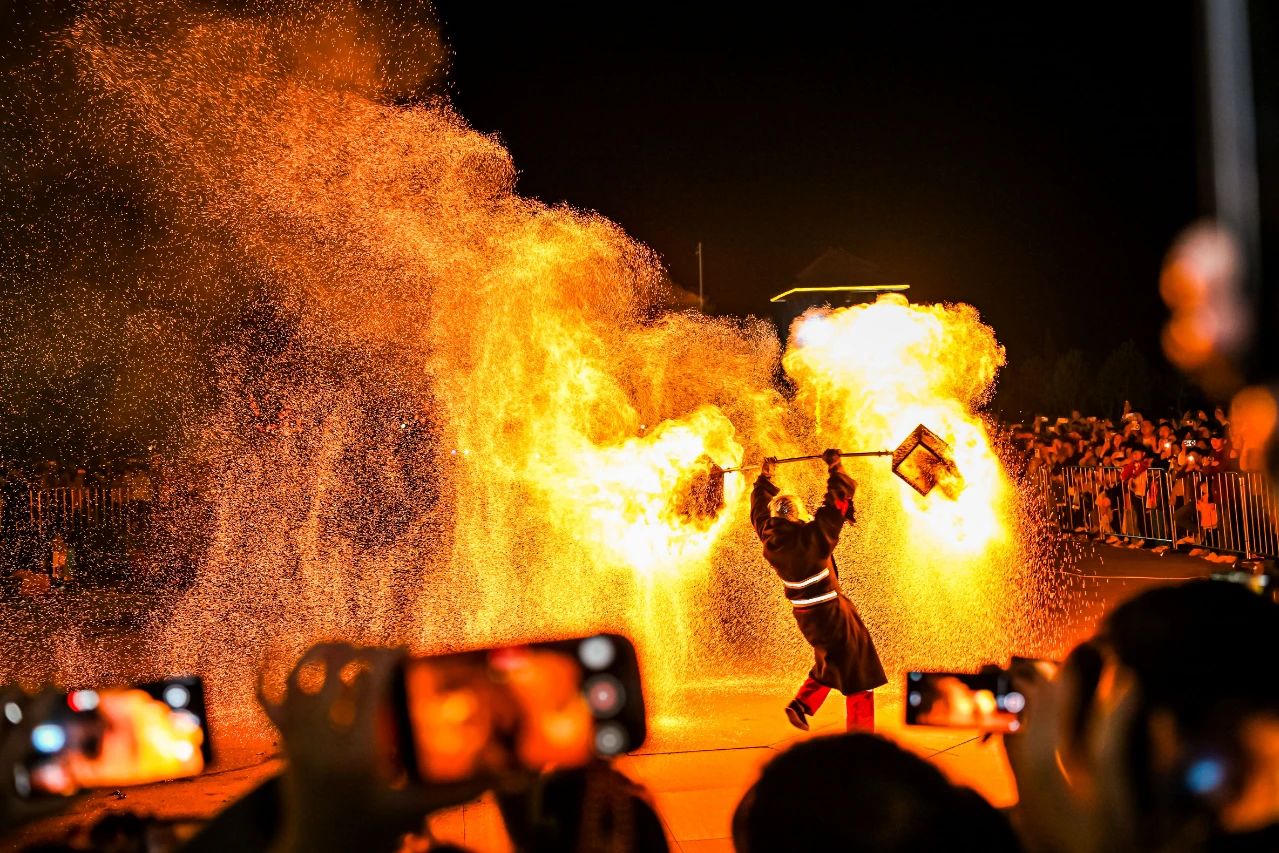 打造系列品牌活動,讓伏羲文化更火、更活、更生動。在伏羲臺璀璨的夜空下,無人機星空秀勾勒出新樂地標與伏羲圖騰的恢弘畫卷,用新質(zhì)生產(chǎn)力詮釋千年文明,營造出震撼人心的視覺盛宴。婚俗文化節(jié)現(xiàn)場,開展中華民族婚俗文化特色展示活動,創(chuàng)新打造“打卡伏羲臺 免費吃家宴”活動品牌。在非遺表演環(huán)節(jié),打樹花、火壺、火刀火棍、火扇火舞等項目在夜空中劃出一道道璀璨的花火,成為游客爭相打卡的亮點。