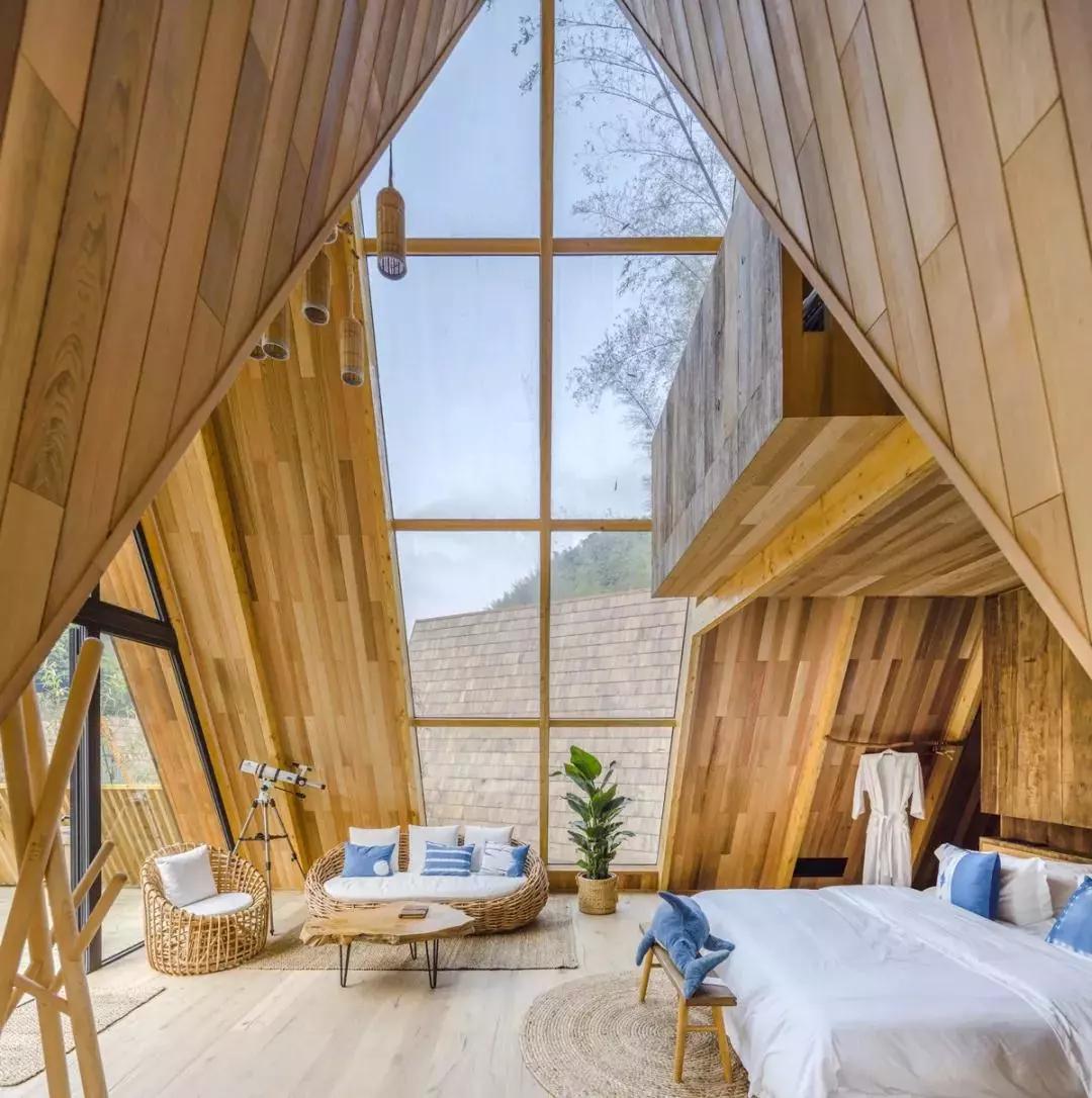 沿著階梯上到一層,一進門就是舒適的雙人床和超大的落地玻璃窗,窗口望出去一片綠意盈盈。室內(nèi)擺放的都是純天然原木家具和手工粗陶餐具,配有地暖、空調(diào)、迷你冰箱、藍牙音箱等設(shè)備,堪稱自然與現(xiàn)代相結(jié)合的典范。
