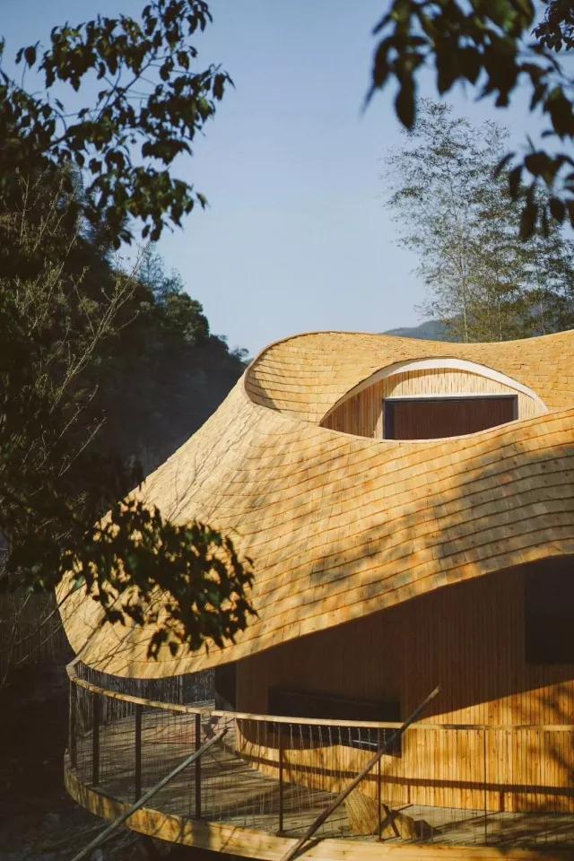 建筑的弧頂形態(tài)流暢,大老遠就很引人注目??拷毧?,每一塊木頭的形狀都是獨一無二的。同時設(shè)計師根據(jù)人的動線和視線,開啟了多個視覺窗戶,使得在鳥巢loft中站、坐、臥、仰,可以欣賞到周遭的不同風光。