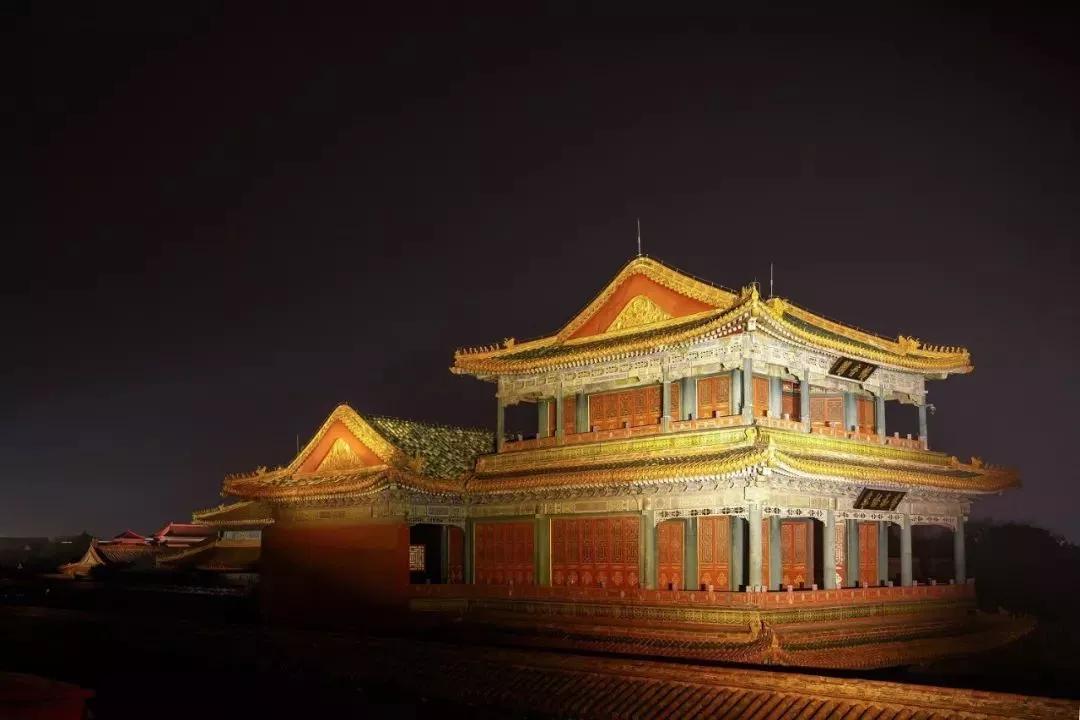 午門城樓及東、西雁翅樓在燈光的映照下,延展雄姿。