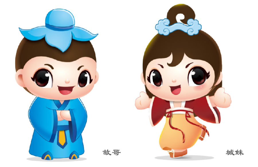 吉祥物“故哥”、“城妹”,代表著故城縣的董子文化與運河文化?!肮矢纭痹忈尪游幕湫蜗鬄槿寮覍W(xué)子,身著漢服,執(zhí)古代士相見禮,低頭微笑作揖,展現(xiàn)了故城縣崇禮重教的文化傳統(tǒng)?!俺敲谩闭蔑@運河文化,發(fā)型如“運河第一灣”,發(fā)飾為由浪花組成的如意形態(tài);眉毛形似柳葉,代表非物質(zhì)文化遺產(chǎn)“掃洪柳”;城妹身著紅色系漢服,彰顯故城千年文化底蘊。兩個吉祥物外表秀美、身形飄逸,凸顯故城兒女的熱情好客。