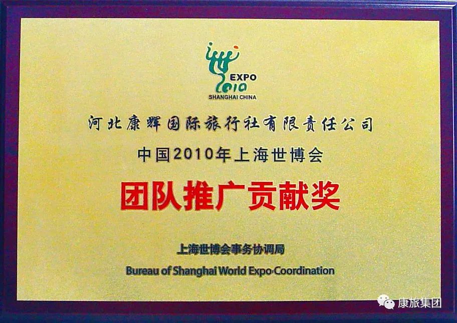 2010 年 ,河北康輝國(guó)際旅行社作為上海世博會(huì)河北省唯一指定旅行社圓滿接待40萬河北游客游世博,被中共河北省委、河北省人民政府授予“河北省參與上海世博會(huì)工作先進(jìn)集體”,被上海世博會(huì)事務(wù)協(xié)調(diào)局授予“中國(guó)2010年上海世界博覽會(huì)團(tuán)隊(duì)推廣貢獻(xiàn)獎(jiǎng)”,集團(tuán)董事長(zhǎng)劉江敏先生被上海世博會(huì)事務(wù)協(xié)調(diào)局授予“中國(guó)2010年上海世界博覽會(huì)團(tuán)隊(duì)推進(jìn)工作優(yōu)秀個(gè)人獎(jiǎng)”,進(jìn)一步夯實(shí)了康輝品牌業(yè)內(nèi)第一的地位。